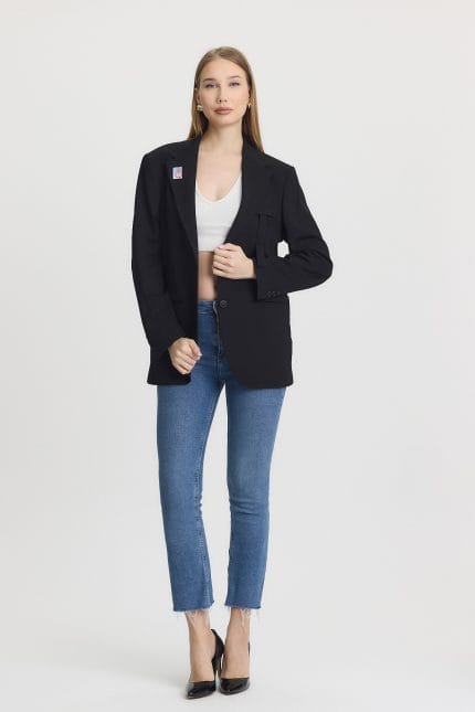 – Zarif tasarımıyla dikkat çeken siyah blazer ceket, her ortamda şıklığınızı ön plana çıkarır. – Full düğme kapama özelliği sayesinde
