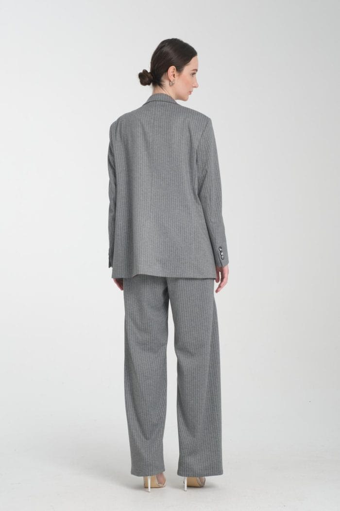Gri Çizgili Desen Bol Paça Pantolonlu Kadın Takım Elbise
