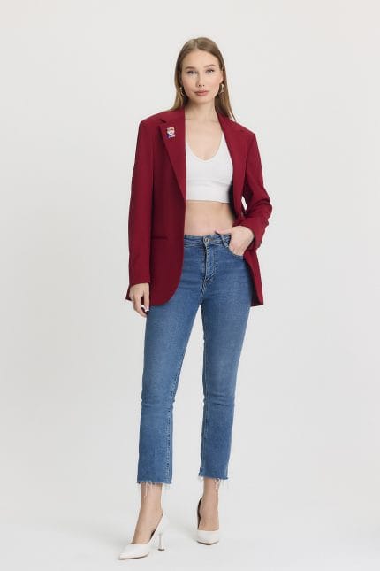 Bordo Çift Düğme Kapamalı Cep Detaylı Blazer Ceket